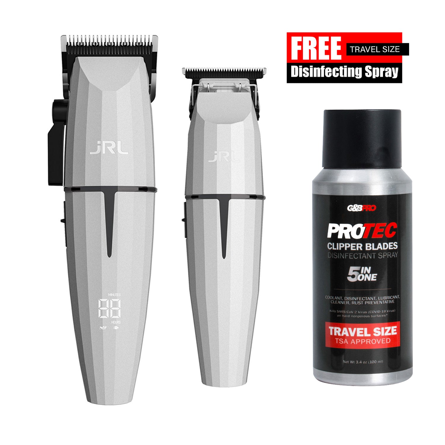 The JRL GHOST Combo features a high-performance clipper and trimmer designed for precision, speed, and quiet operation. With advanced blade technology and ergonomic design, it ensures smooth fades and sharp detailing. Includes PRO Essentials: a travel-size disinfecting spray for a clean, professional finish. Perfect for barbers and stylists who value style, control, and performance.