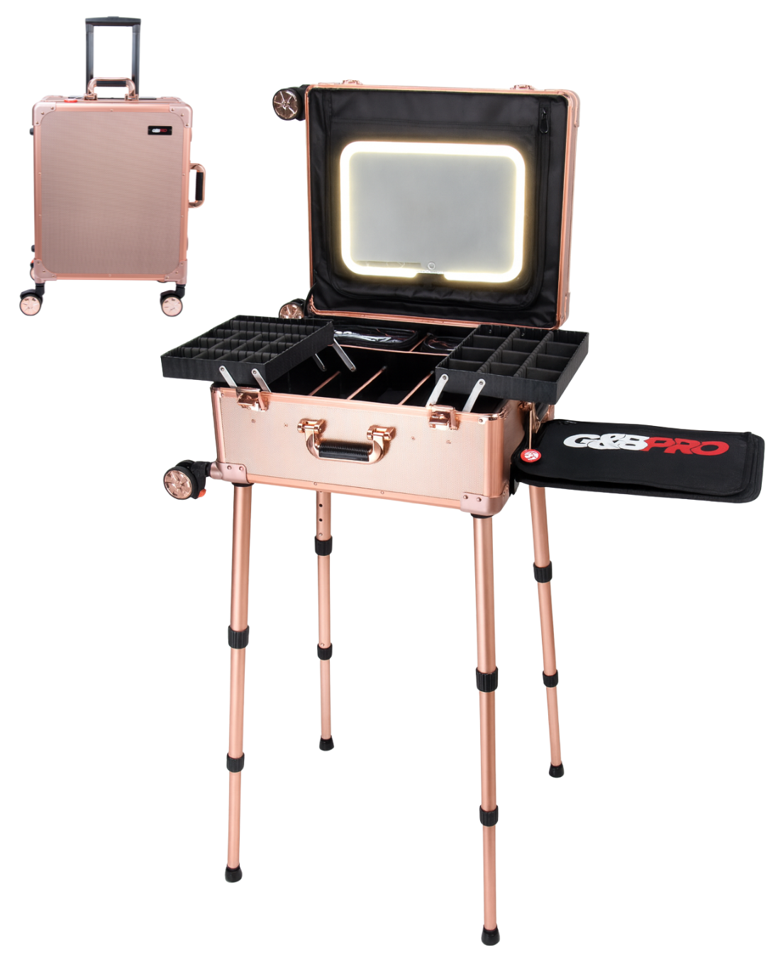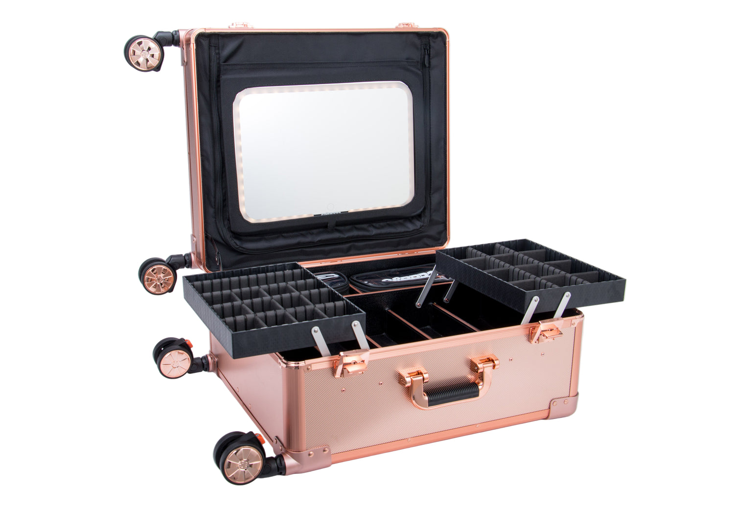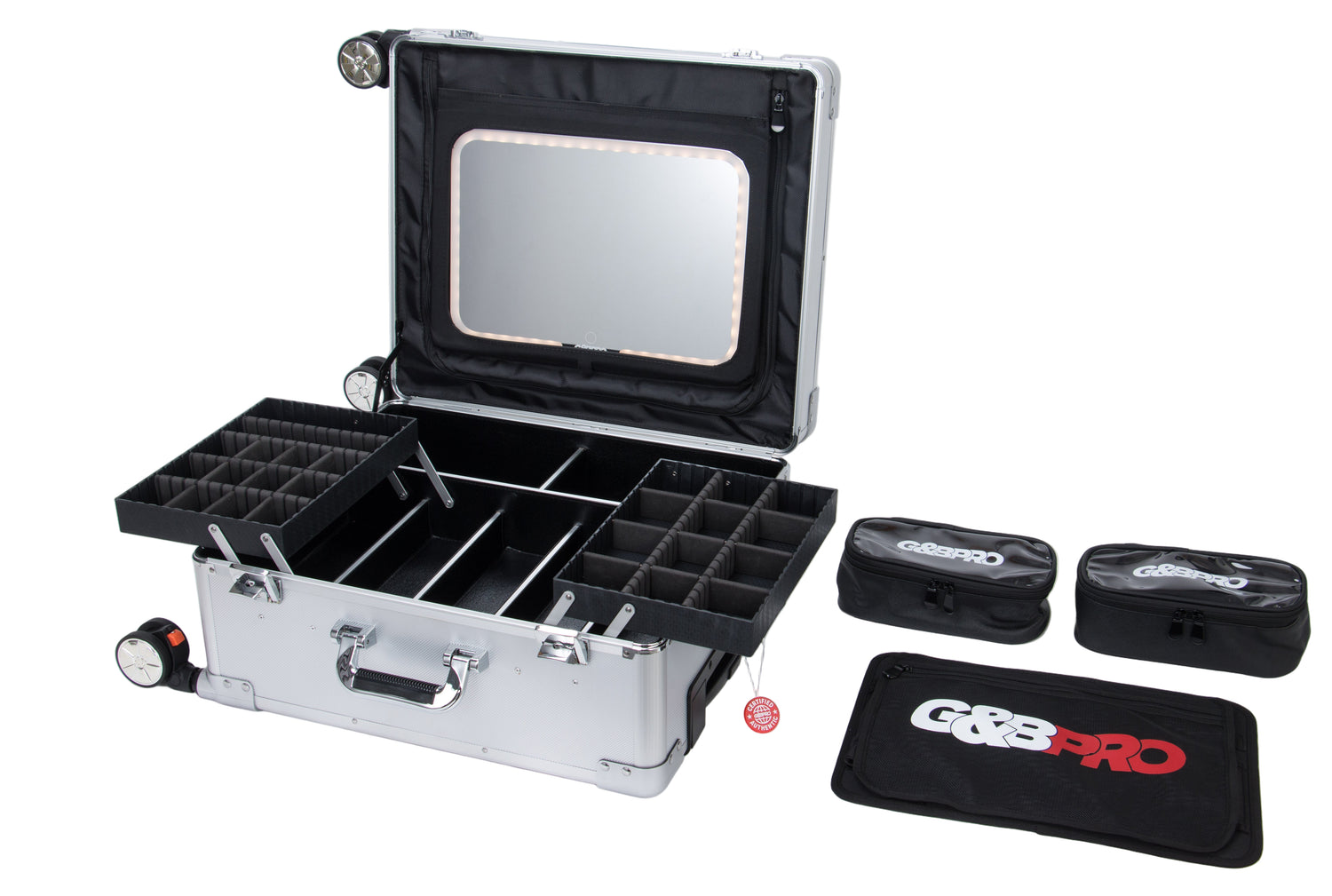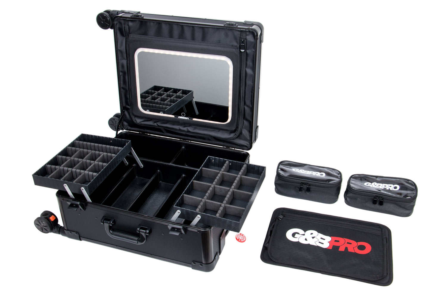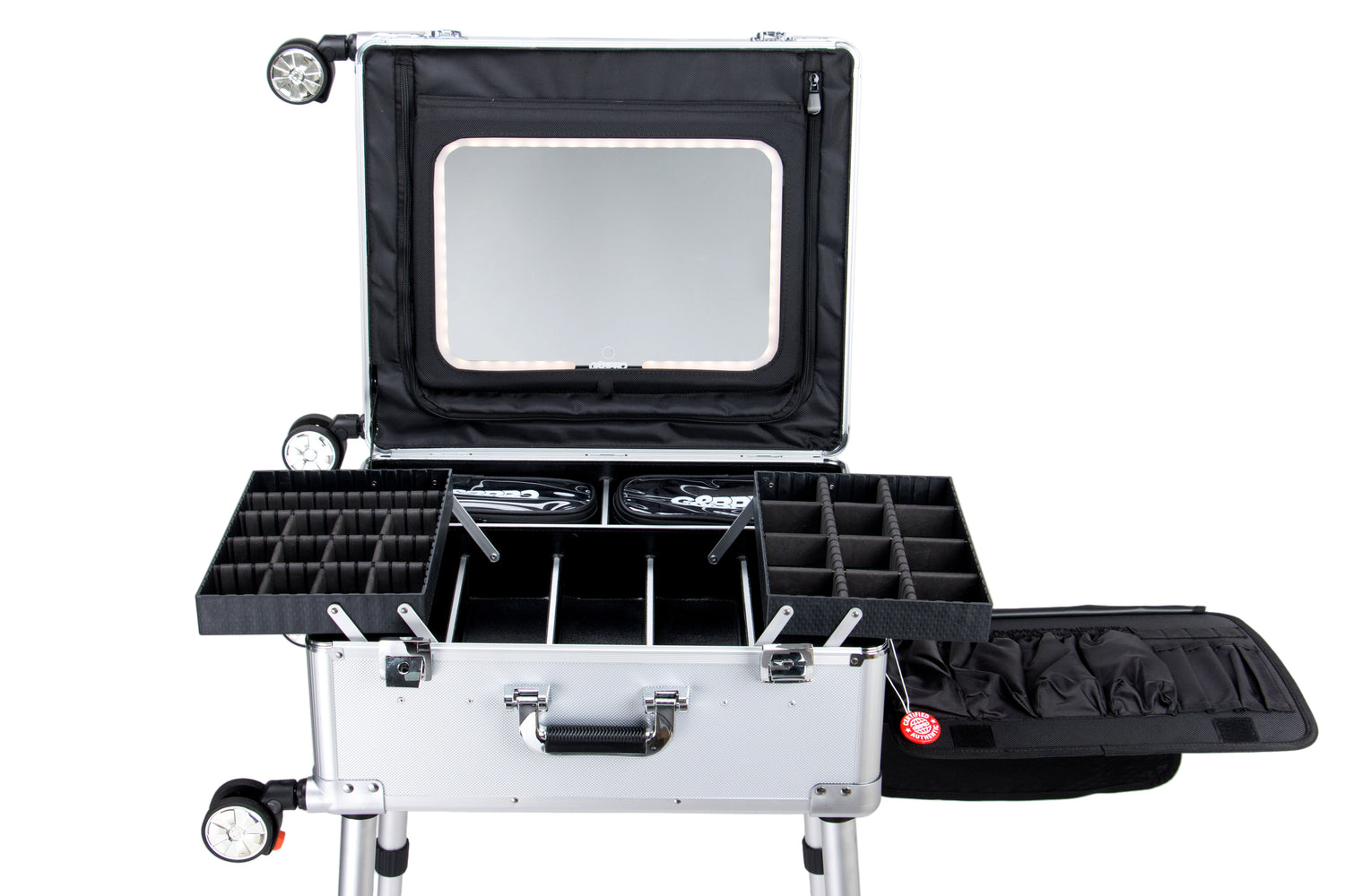 Ultimate roller mobile station with patented extending tray system, modular interior, 360° wheels, hidden leg compartments, wireless LED mirror, packing cubes, and organizing pouch, fits all your tools and sets up instantly for work anywhere.
