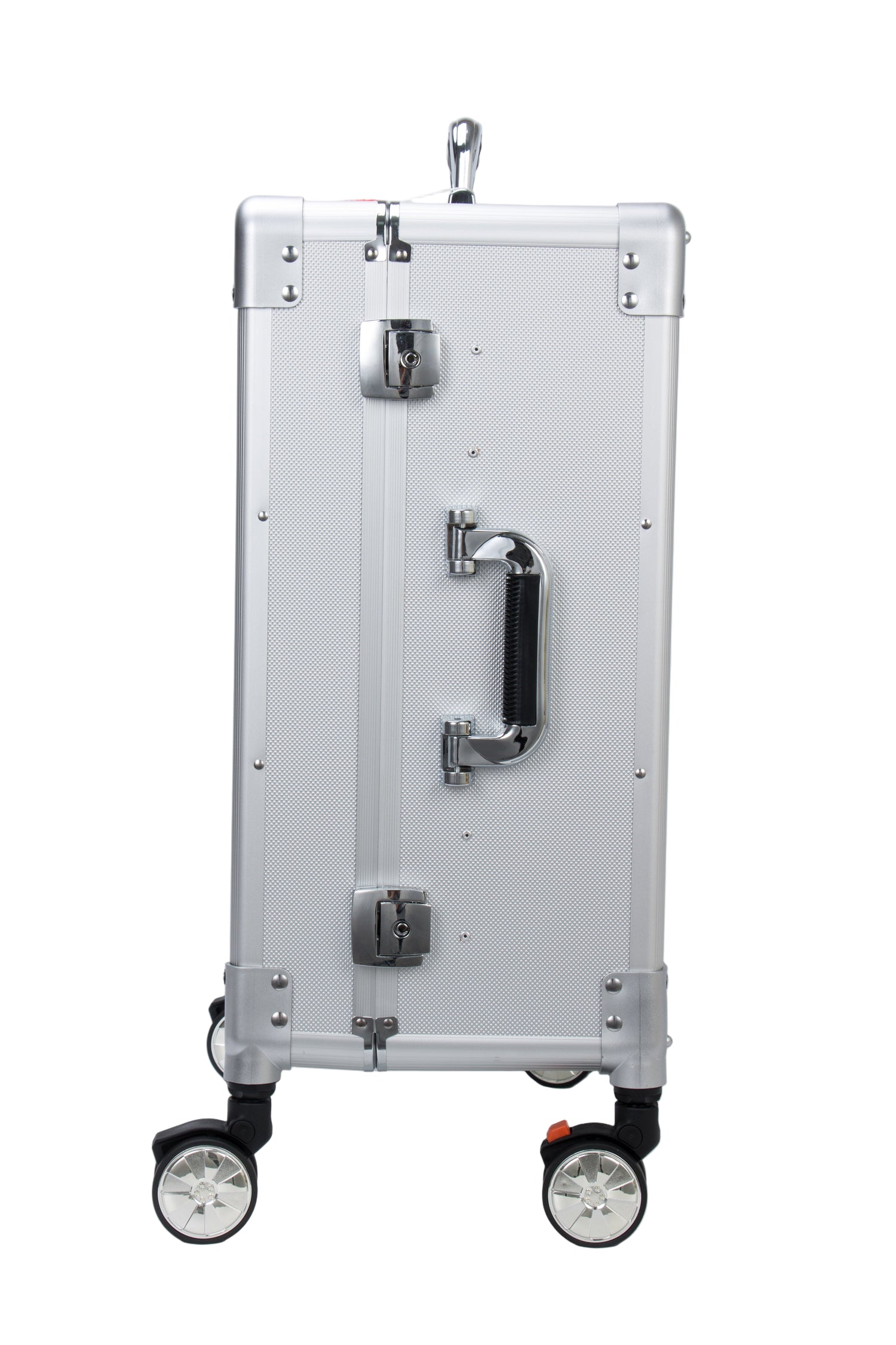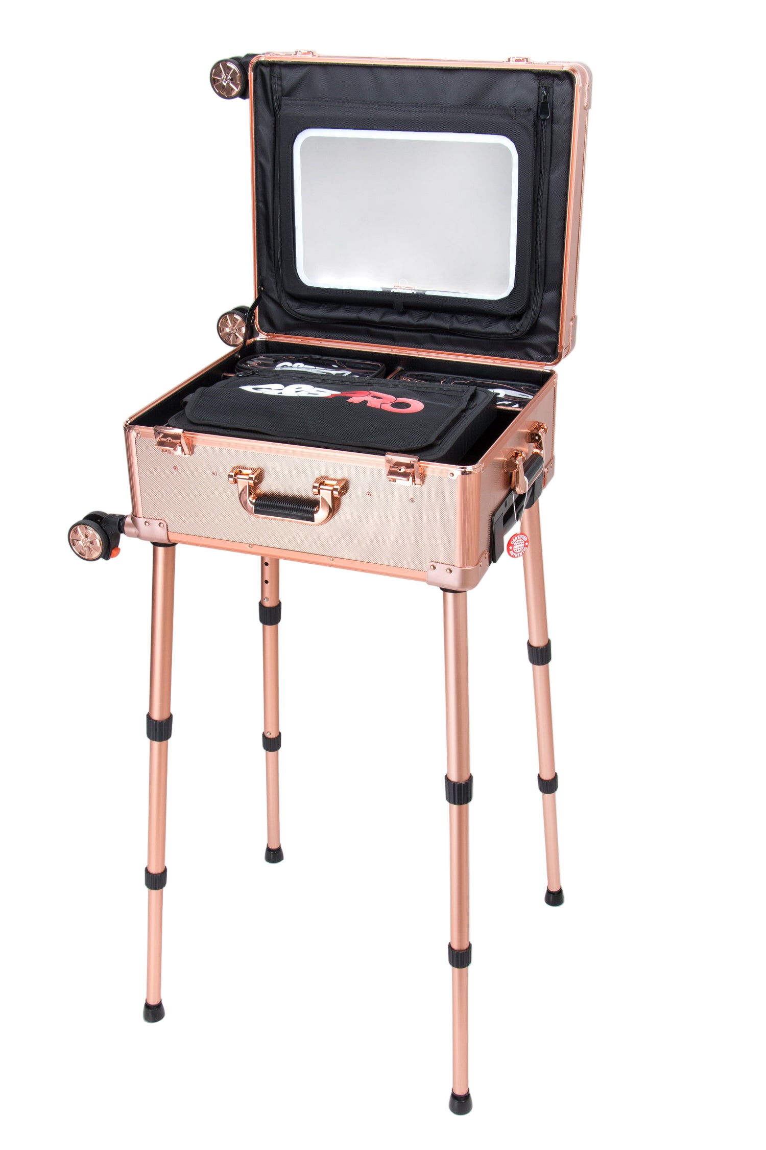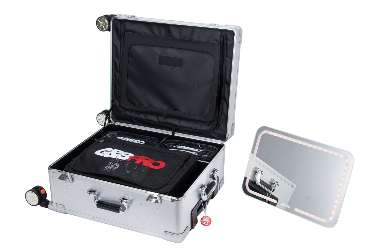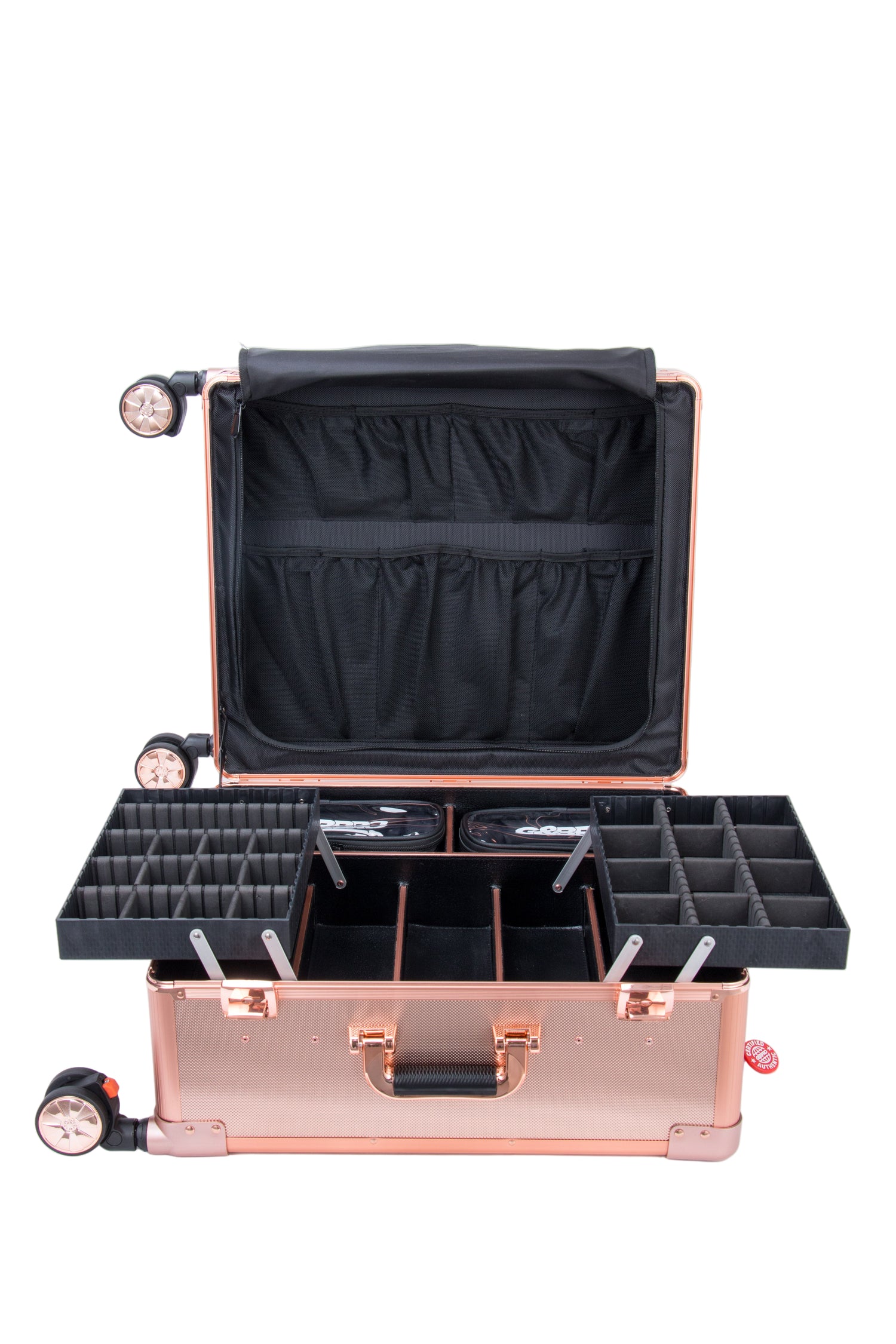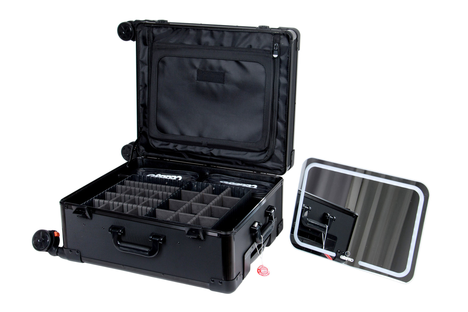 Ultimate roller mobile station with patented extending tray system, modular interior, 360° wheels, hidden leg compartments, wireless LED mirror, packing cubes, and organizing pouch, fits all your tools and sets up instantly for work anywhere.