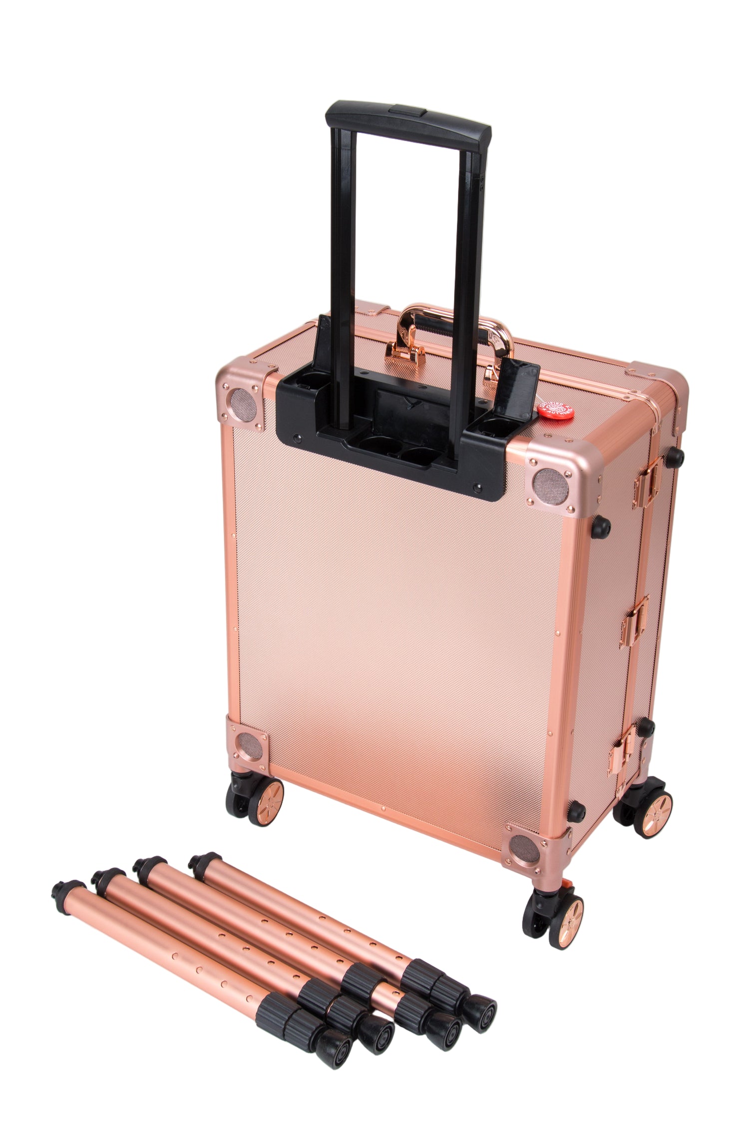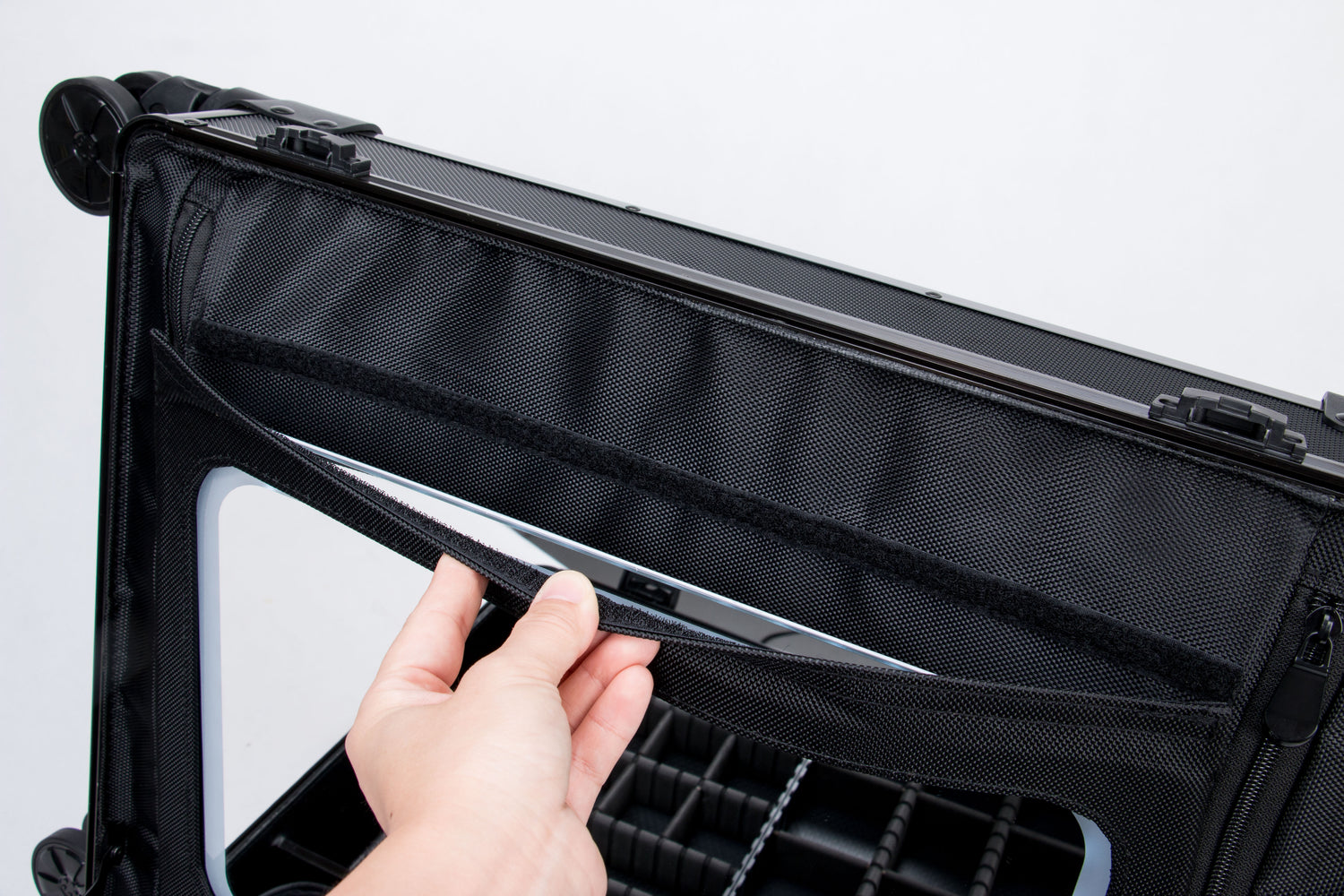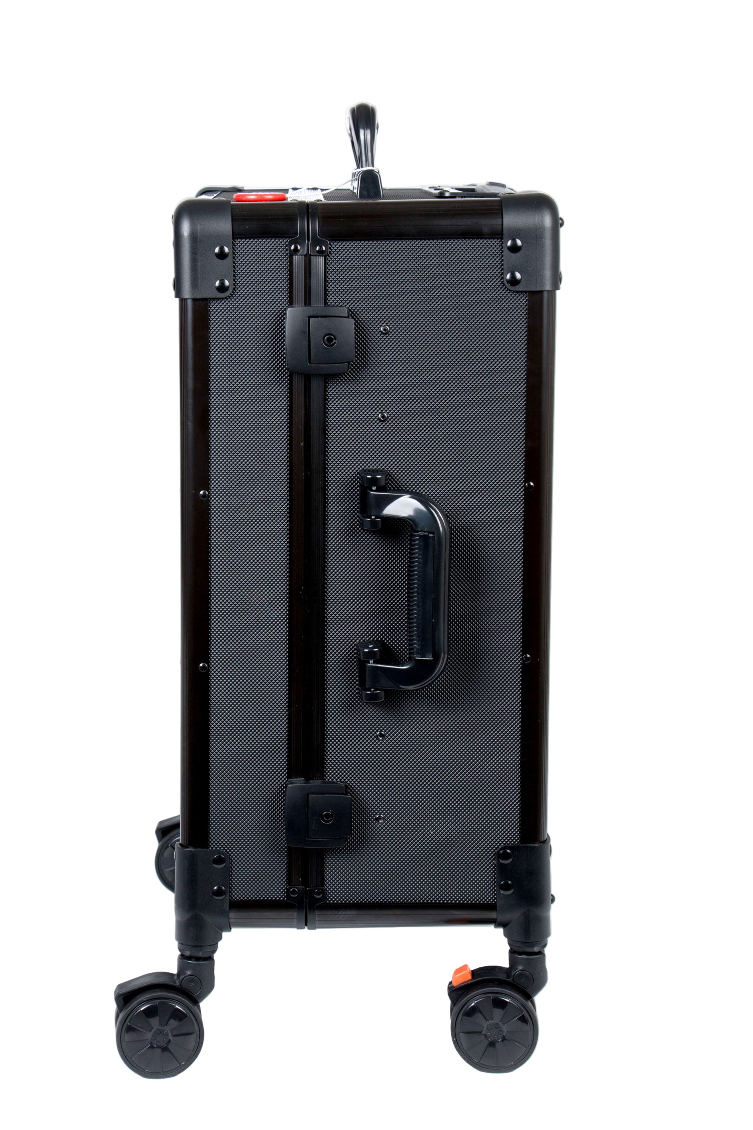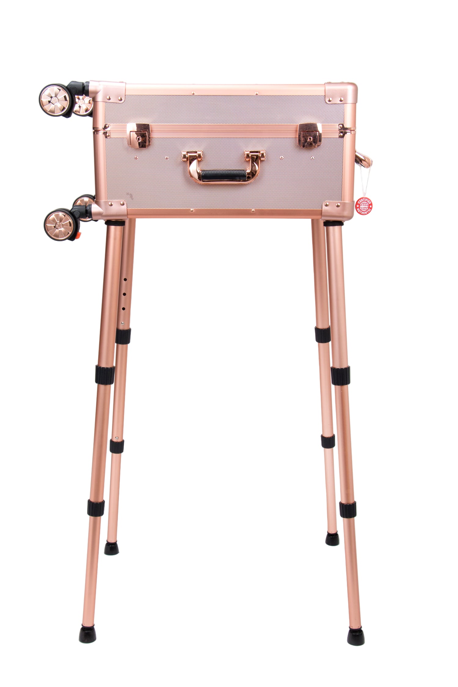 Ultimate roller mobile station with patented extending tray system, modular interior, 360° wheels, hidden leg compartments, wireless LED mirror, packing cubes, and organizing pouch, fits all your tools and sets up instantly for work anywhere.