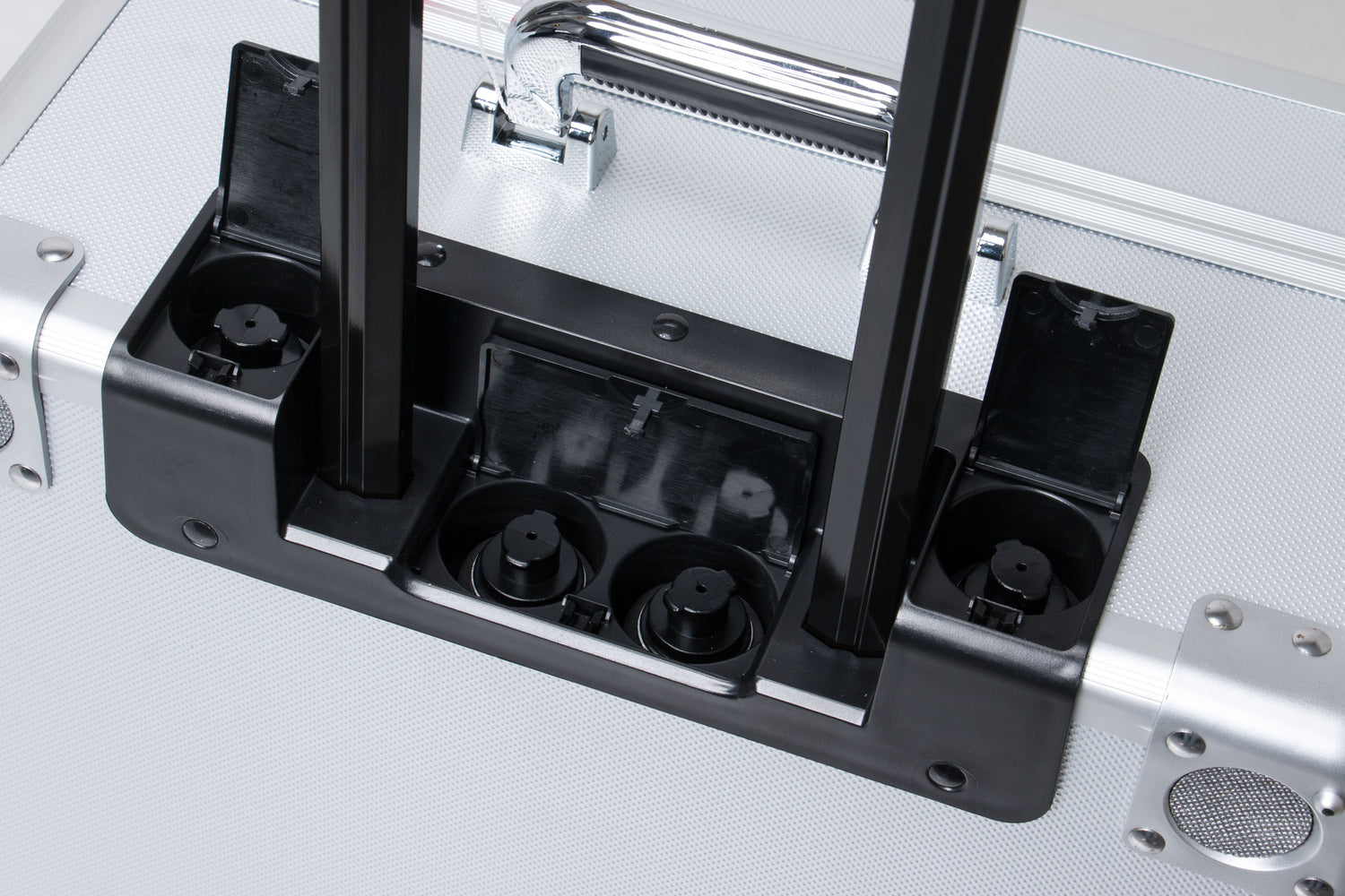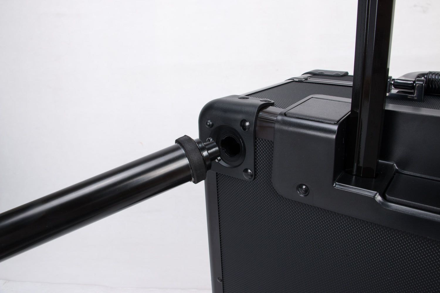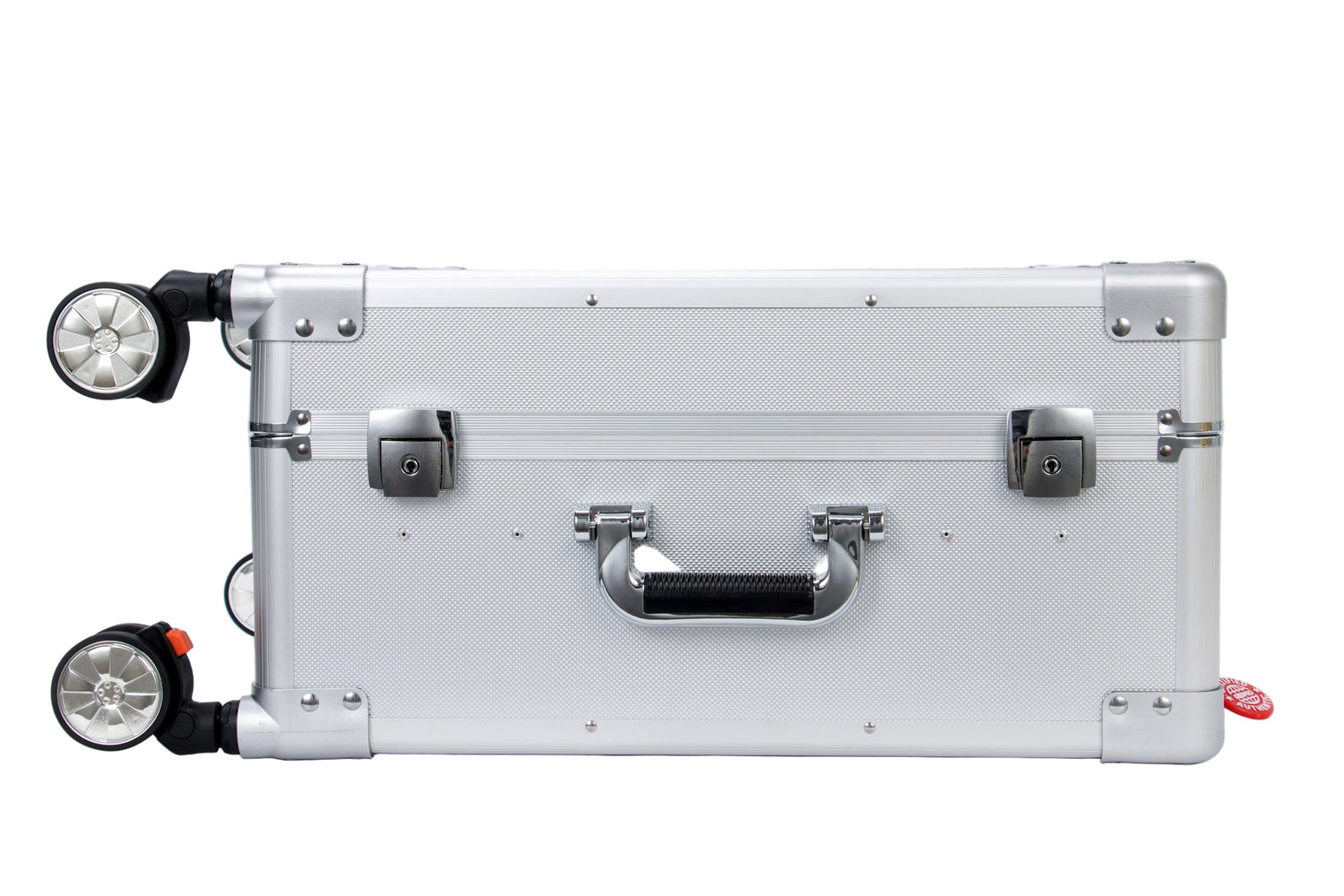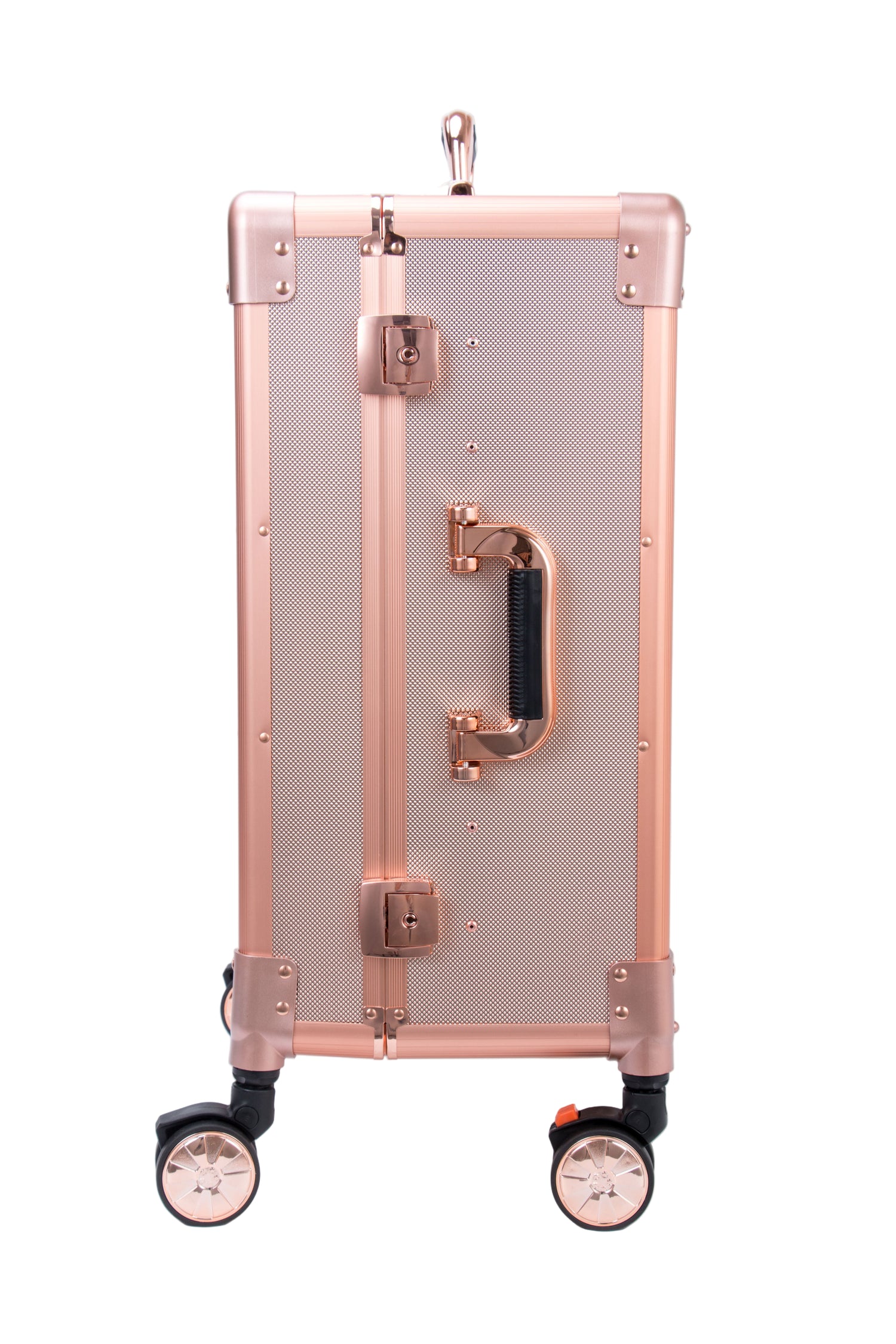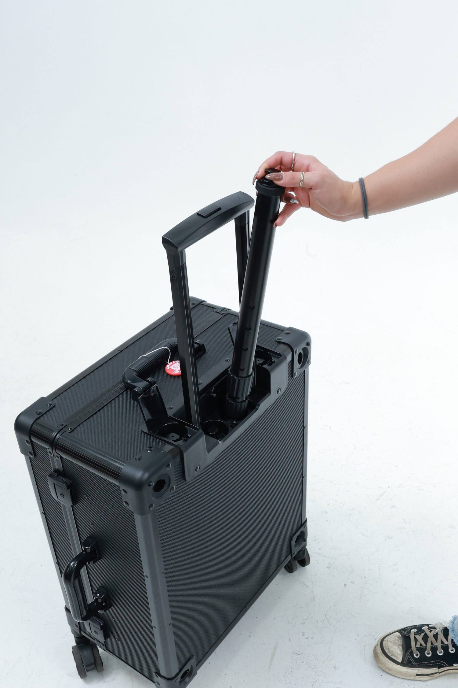 Ultimate roller mobile station with patented extending tray system, modular interior, 360° wheels, hidden leg compartments, wireless LED mirror, packing cubes, and organizing pouch, fits all your tools and sets up instantly for work anywhere.