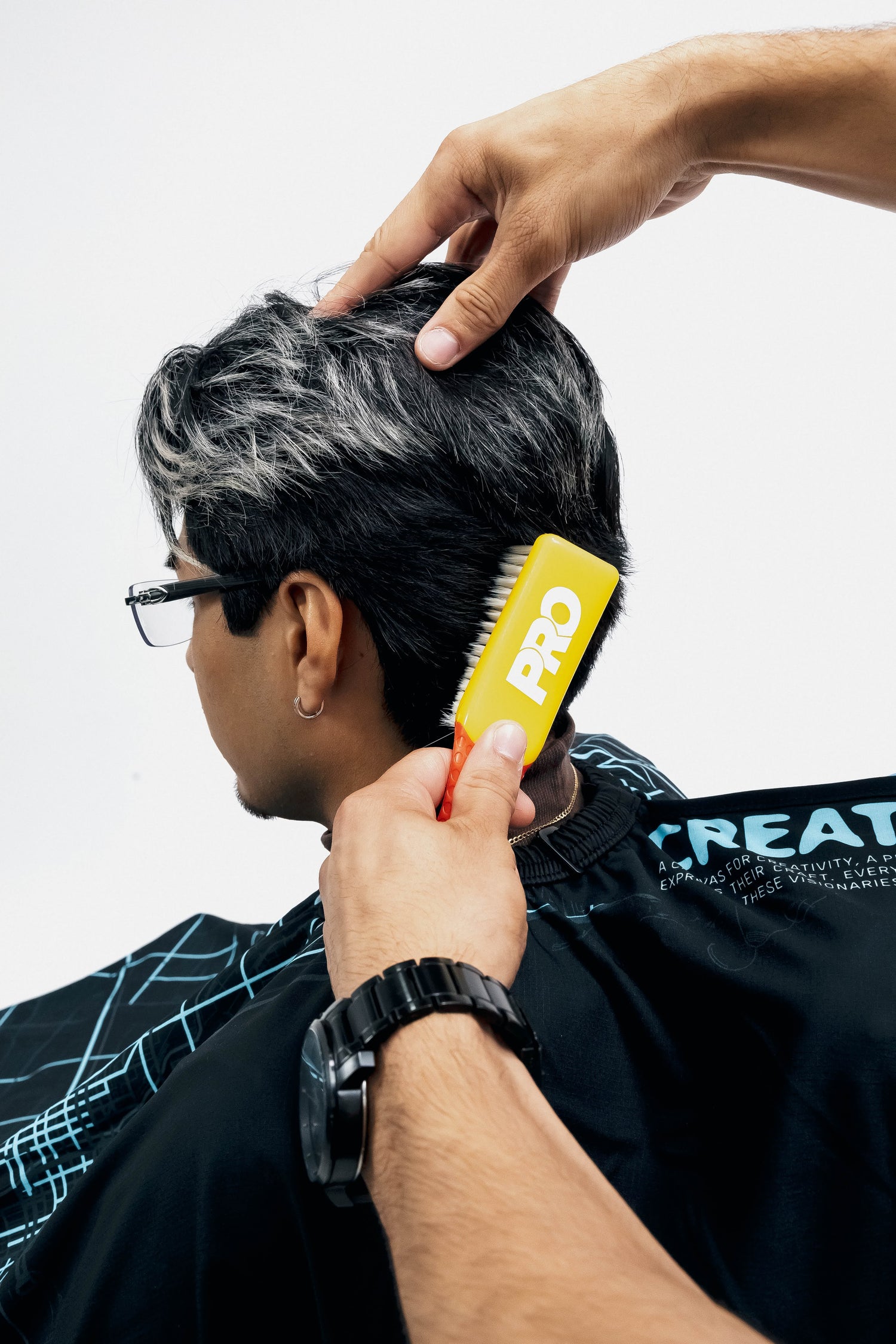 Durable, hygienic fade brush with rubber grip for precise control. Removes loose hair with ease, available in vibrant colors, easy to sanitize, and built for daily professional use.